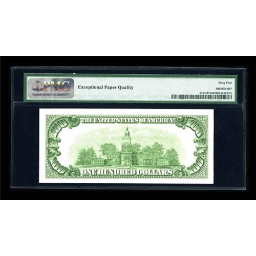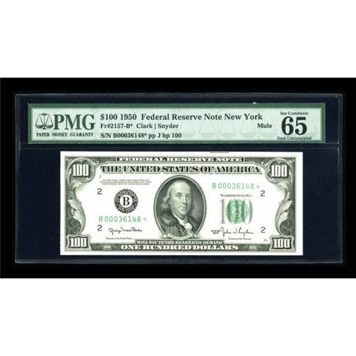 <B>Fr. 2157-B* $100 1950 Mule Federal Reserve Note. PMG Gem Uncirculated 65 EPQ.</B></I><BR> This is perhaps the finest known replacement from this district for this issue. It is also the lowest serial number reported in the Schwartz/Lindquist guide.<BR><BR><b>Shipping:</b> Coins & Currency (<a target="_blank" href="http://www.heritageauctions.com/common/shipping.php">view shipping information</a>)