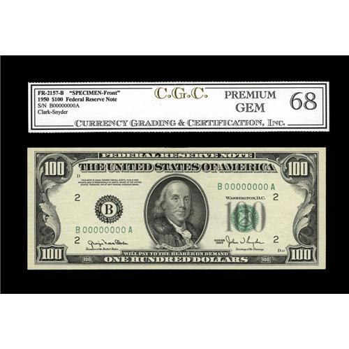 <B>Fr. 2157-B $100 1950 Specimen Federal Reserve Note. Superb Gem Crisp Uncirculated.</B></I><BR>This is a simply superlative Specimen which is far and away the nicest such example we've ever auctioned. It has been graded as "Premium Gem 68" by CGC, (which is the highest grade we've ever seen CGC to assign to any piece of US currency) and the strip from the holder, from which it has been removed, accompanies the note. It is essentially perfect, and, unlike the Series 1950 Specimen set we sold in the Taylor Family collection, lacks the disfiguring punch out cancels found there.