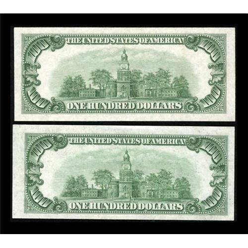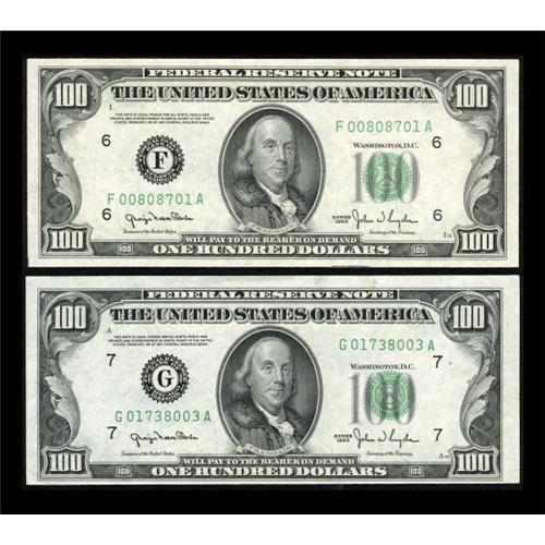 <B>Fr. 2157-F; G $100 1950 Mule Federal Reserve Notes. Choice Crisp Uncirculated or Better.</B></I><BR> But for a bit more centering, this pair of Mule C-notes would both be original gems.<BR><I>From The Thomas M. Flynn Collection</B></I><BR><BR><b>Shipping:</b> Coins & Currency (<a target="_blank" href="http://www.heritageauctions.com/common/shipping.php">view shipping information</a>)