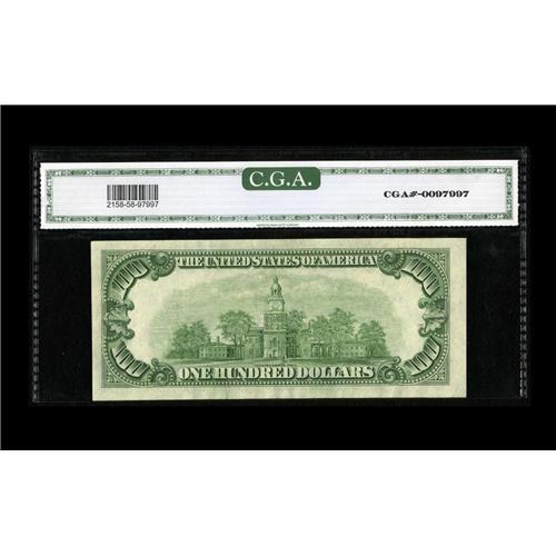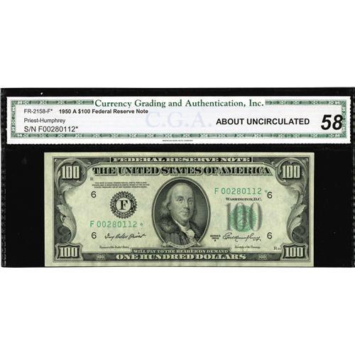 <B>Fr. 2158-F* $100 1950A Federal Reserve Note. CGA About Uncirculated 58.</B></I><BR>This example was sold in our Central States sale and is the only known replacement note from Atlanta. No value is mentioned in the current Oakes 6th Edition. CGA agreed with our determination of grade at that time.