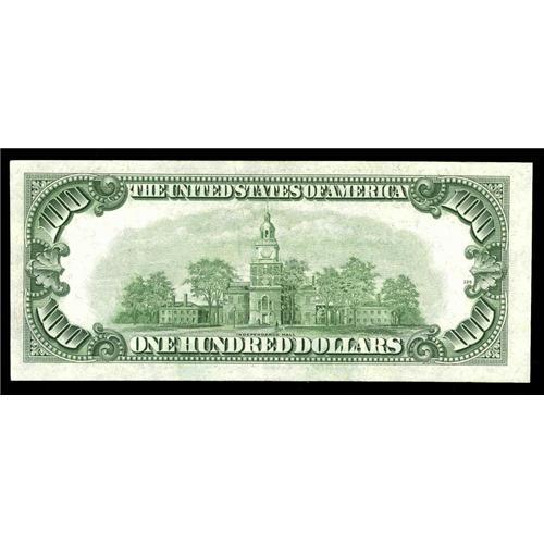 <B>Fr. 2158-F* $100 1950A Federal Reserve Note. Choice About Uncirculated.</B></I><BR>This example is the first Atlanta Star to surface within the collecting community, as the new 6th edition of Oakes does not list any notes recorded. A very faint fold is detected at center on this discovery piece.
