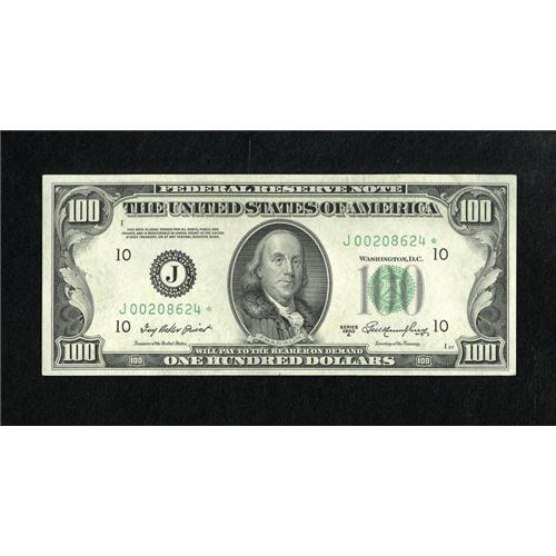 <B>Fr. 2158-J* $100 1950A Federal Reserve Note. Choice Crisp Uncirculated.</B></I><BR>This is a well margined example from this scarce star issue.<BR><BR><b>Shipping:</b> Coins & Currency (<a target="_blank" href="http://www.heritageauctions.com/common/shipping.php">view shipping information</a>)
