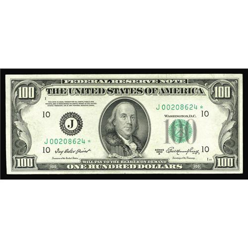 <B>Fr. 2158-J* $100 1950A Federal Reserve Note. Choice Crisp Uncirculated.</B></I><BR>This is a nicely preserved Star from an era when $100 could represent a week's wages.