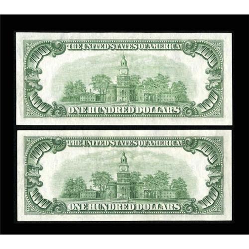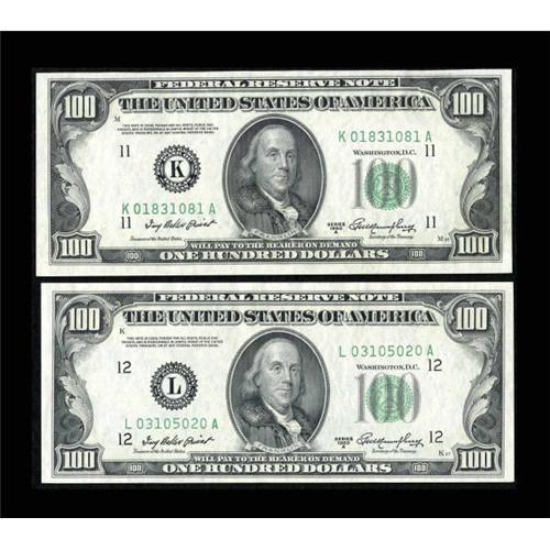 <B>Fr. 2158-K; L $100 1950A Federal Reserve Notes. Choice Crisp Uncirculated or Better.</B></I><BR> Punch through embossing and plenty of natural paper wave is seen on this quality pair of FRNs from the 1950's.<BR><I>From The Thomas M. Flynn Collection</B></I><BR><BR><b>Shipping:</b> Coins & Currency (<a target="_blank" href="http://www.heritageauctions.com/common/shipping.php">view shipping information</a>)