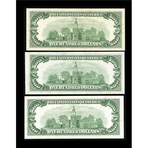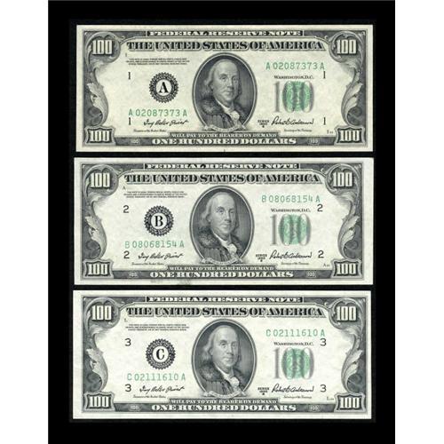 <B>Fr. 2159-A; B; C $100 1950B Federal Reserve Notes. Choice Crisp Uncirculated or Better.</B></I><BR> Robert R. Anderson is now the Treasury Secretary and his signature appears on this trio of C-notes. All three of these notes have decent centering and a couple of them approach gem status.<BR><I>From The Thomas M. Flynn Collection</B></I><BR><BR><b>Shipping:</b> Coins & Currency (<a target="_blank" href="http://www.heritageauctions.com/common/shipping.php">view shipping information</a>)