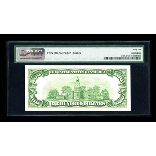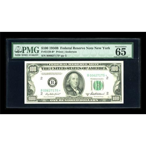 <B>Fr. 2159-B* $100 1950B Federal Reserve Note. PMG Gem Uncirculated 65 EPQ.</B></I><BR> The paper originality is easily visible through the third party holder.<BR><BR><b>Shipping:</b> Coins & Currency (<a target="_blank" href="http://www.heritageauctions.com/common/shipping.php">view shipping information</a>)