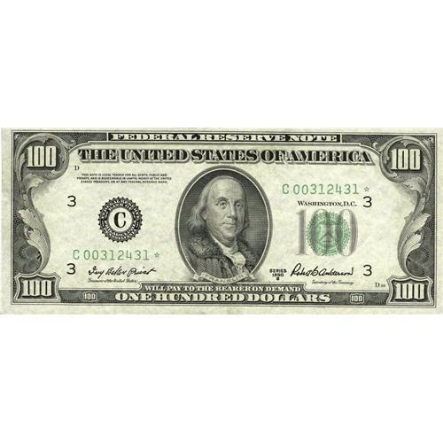 <B>Fr. 2159-C* $100 1950B Federal Reserve Note. Choice Crisp Uncirculated.</B></I><BR>A scarce modern star we'd have graded as a Gem but for minor centering issues only.