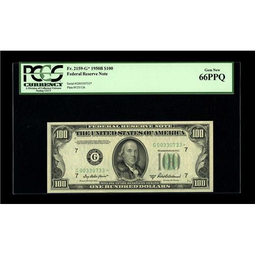 <B>Fr. 2159-G* $100 1950B Federal Reserve Note. PCGS Gem New 66PPQ.</B></I><BR>As fresh and pretty a star example as you could hope to find.<BR><I>From The Bill and Kathy Stella Currency Collection</B></I><BR><BR><b>Shipping:</b> Coin/Currency (<a target="_blank" href="http://www.heritageauctions.com/common/shipping.php">view shipping information</a>)