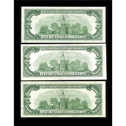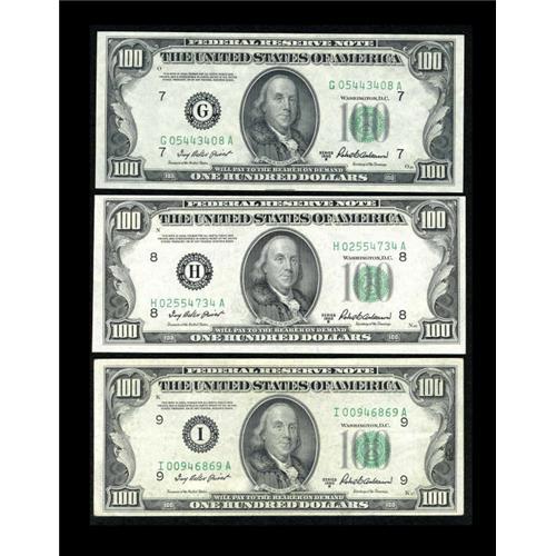 <B>Fr. 2159-G; H; I $100 1950B Federal Reserve Notes. Extremely Fine or Better.</B></I><BR> The Minneapolis note in this trio shows a couple of folds but the Chicago and St. Louis examples are <B>Choice Crisp Uncirculated</B></I> or a bit better.<BR><I>From The Thomas M. Flynn Collection</B></I><BR><BR><b>Shipping:</b> Coins & Currency (<a target="_blank" href="http://www.heritageauctions.com/common/shipping.php">view shipping information</a>)