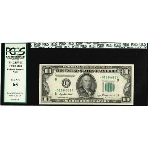<B>Fr. 2159-H $100 1950B Federal Reserve Note. PCGS Gem New 65.</B></I><BR>Nicely margined Hundred that is signed by Priest and Anderson.