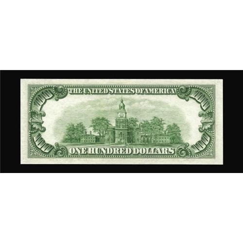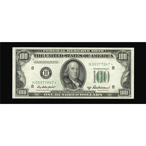 <B>Fr. 2159-H* $100 1950B Federal Reserve Note. Very Choice Crisp Uncirculated.</B></I><BR>Just shy of full Gem status due to a few very subtle handling indications, otherwise bordering on the pristine. This is an especially difficult star to acquire in such a high grade and we expect fierce competition.