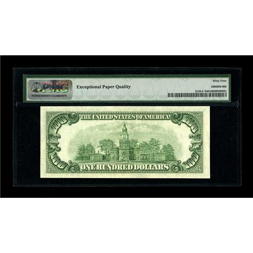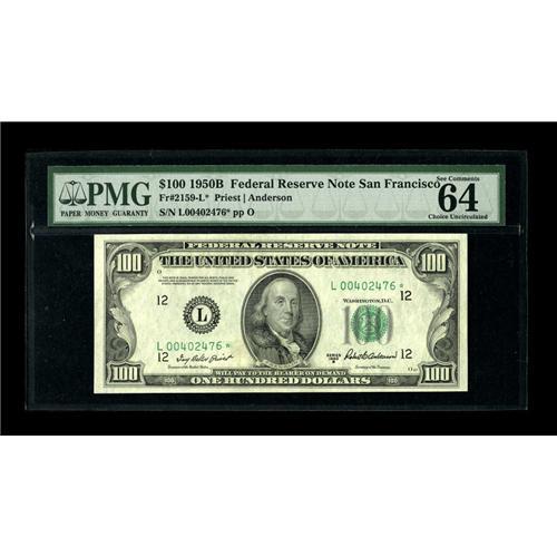 <B>Fr. 2159-L* $100 1950B Federal Reserve Note. PMG Choice Uncirculated 64 EPQ.</B></I><BR>The paper quality is exceptional, with the eggshell texture associated with this and some of the other 1950's Series.<BR><I>From The Lincoln Collection</B></I><BR><BR><b>Shipping:</b> Coins & Currency (<a target="_blank" href="http://www.heritageauctions.com/common/shipping.php">view shipping information</a>)