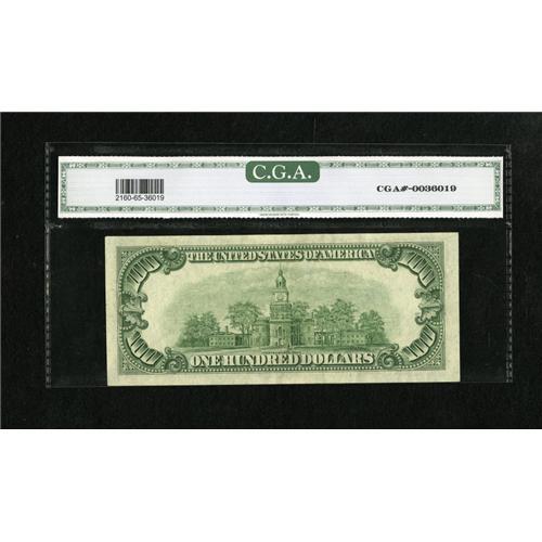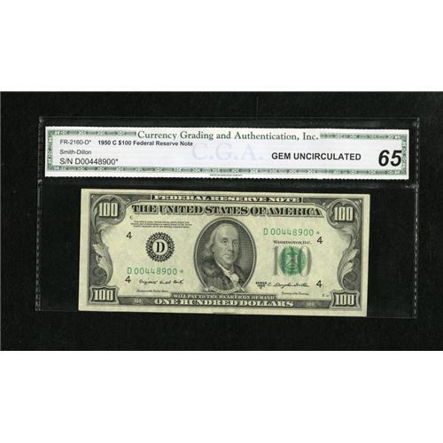 <B>Fr. 2160-D* $100 1950C Federal Reserve Note. CGA Gem Uncirculated 65.</B></I><BR>Fresh and bright paper surfaces lend credence to the grade for this Cleveland star.<BR><BR><b>Shipping:</b> Coins & Currency (<a target="_blank" href="http://www.heritageauctions.com/common/shipping.php">view shipping information</a>)