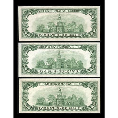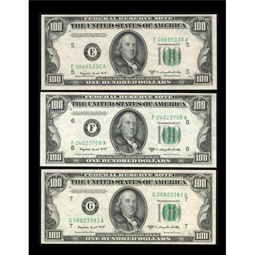 <B>Fr. 2160-E; F; G $100 1950C Federal Reserve Notes. Choice Crisp Uncirculated.</B></I><BR> Nice embossing and excellent paper quality are seen on this trio of C-notes that were issued almost 50 years ago.<BR><I>From The Thomas M. Flynn Collection</B></I><BR><BR><b>Shipping:</b> Coins & Currency (<a target="_blank" href="http://www.heritageauctions.com/common/shipping.php">view shipping information</a>)