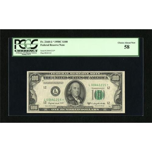 <B>Fr. 2160-L* $100 1950C Federal Reserve Note. PCGS Choice About New 58.</B></I><BR> There are hints of embossing on this well margined note.<BR><BR><b>Shipping:</b> Coins & Currency (<a target="_blank" href="http://www.heritageauctions.com/common/shipping.php">view shipping information</a>)