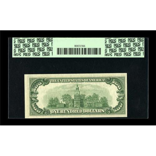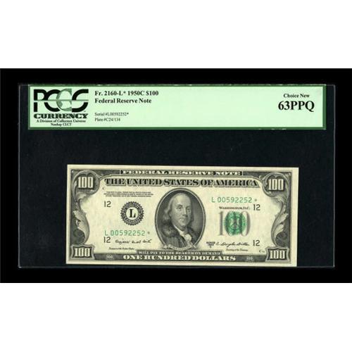 <B>Fr. 2160-L* $100 1950C Federal Reserve Note. PCGS Choice New 63PPQ.</B></I><BR> Notes from this district are notoriously difficult to locate without distracting handling marks. This piece, fortunately, is a happy exception. <BR><BR><b>Shipping:</b> Coins & Currency (<a target="_blank" href="http://www.heritageauctions.com/common/shipping.php">view shipping information</a>)