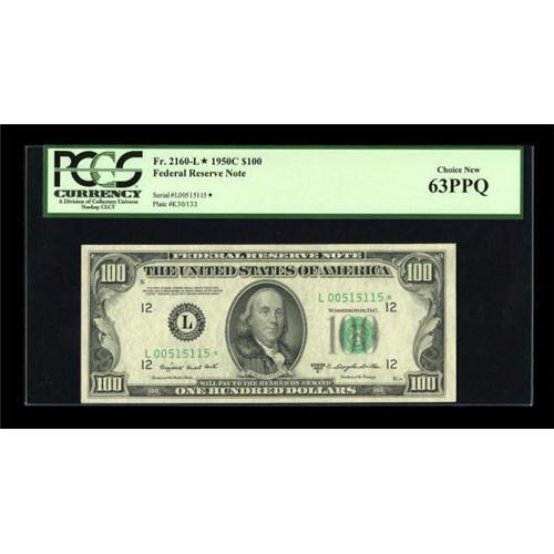 <B>Fr. 2160-L* $100 1950C Federal Reserve Star Note. PCGS Choice New 63PPQ.</B></I><BR> This is a bright replacement note from this elusive issue.<BR><BR><b>Shipping:</b> Coins & Currency (<a target="_blank" href="http://www.heritageauctions.com/common/shipping.php">view shipping information</a>)