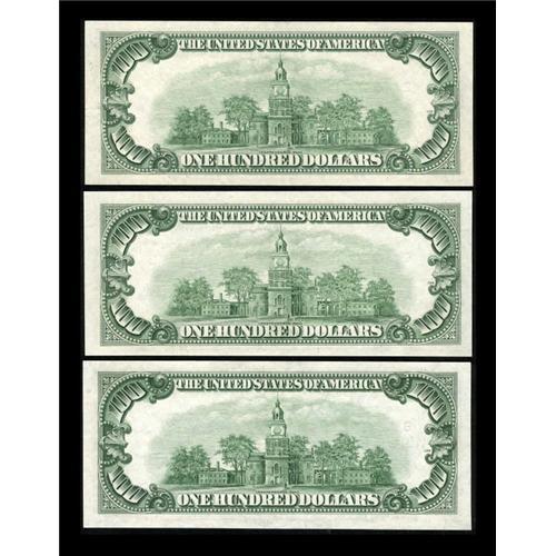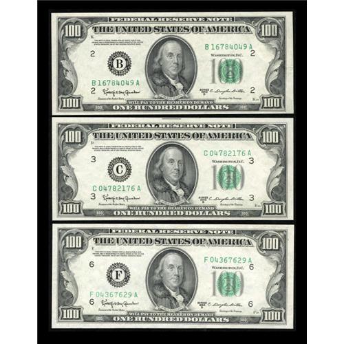<B>Fr. 2161-B; C; F $100 1950D Federal Reserve Notes. Choice Crisp Uncirculated or Better.</B></I><BR> Crackling fresh surfaces are abundant on all three of these $100s that were issued in the 1960's.<BR><I>From The Thomas M. Flynn Collection</B></I><BR><BR><b>Shipping:</b> Coins & Currency (<a target="_blank" href="http://www.heritageauctions.com/common/shipping.php">view shipping information</a>)