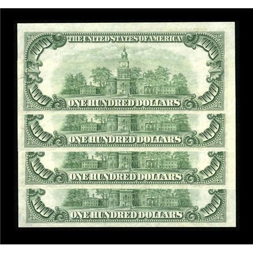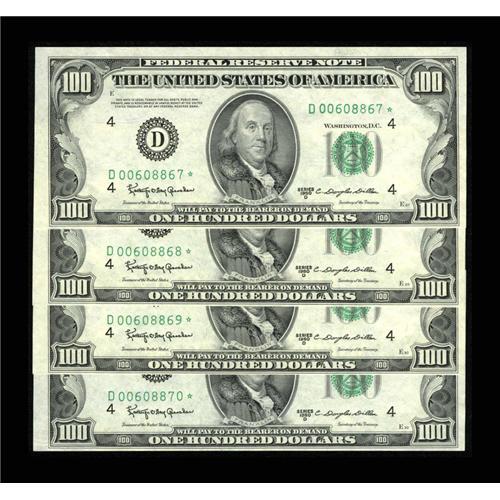 <B>Fr. 2161-D* $100 1950D Federal Reserve Notes. Four Consecutive Examples Crisp Uncirculated.</B></I><BR>These early high denomination replacements have plenty of embossing, paper wave, and snap. Unfortunately they are quite tight along the bottom.<BR><BR><b>Shipping:</b> Coins & Currency (<a target="_blank" href="http://www.heritageauctions.com/common/shipping.php">view shipping information</a>)