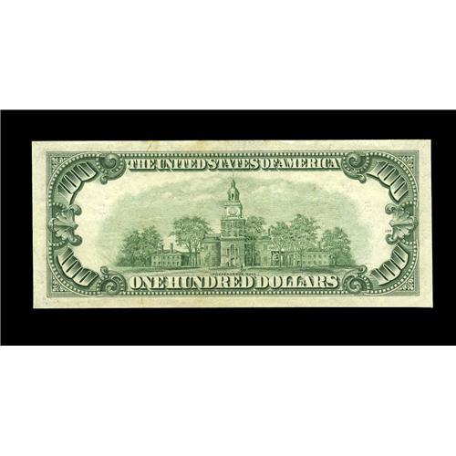 <B>Fr. 2161-E* $100 1950D Federal Reserve Note. Very Choice Crisp Uncirculated.</B></I><BR> Most Series 1950D Star C-Notes are seen from the New York, Chicago, or San Francisco districts. A bid tonight on a slightly more scarce note would add allure to any small size collection. The margins on this note preclude it from a Gem designation.