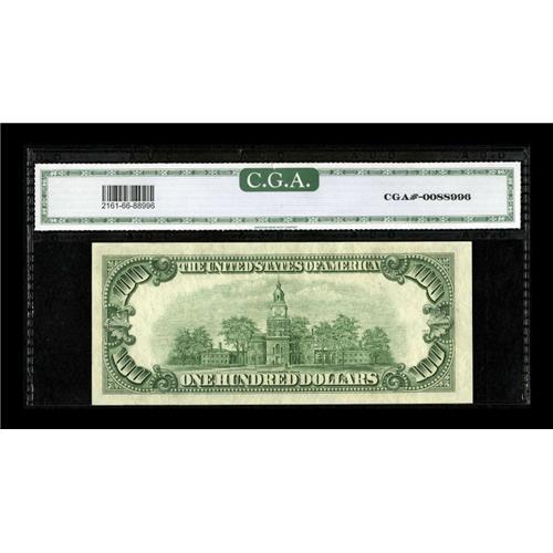 <B>Fr. 2161-G* $100 1950D Federal Reserve Note. CGA Gem Uncirculated 66.</B></I><BR>Solid margins surround this issue.<BR><BR><b>Shipping:</b> Coins & Currency (<a target="_blank" href="http://www.heritageauctions.com/common/shipping.php">view shipping information</a>)