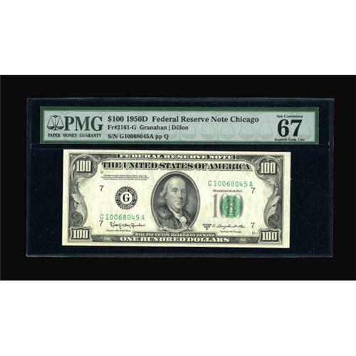 <B>Fr. 2161-G $100 1950D Federal Reserve Note. PMG Superb Gem Unc 67 EPQ.</B></I><BR> This example, which PMG has graded Superb Gem Uncirculated 67 EPQ, is tied with two others for the highest grade Series 1950D Chicago $100 Fed slabbed by PMG to date. <BR><BR><b>Shipping:</b> Coins & Currency (<a target="_blank" href="http://www.heritageauctions.com/common/shipping.php">view shipping information</a>)
