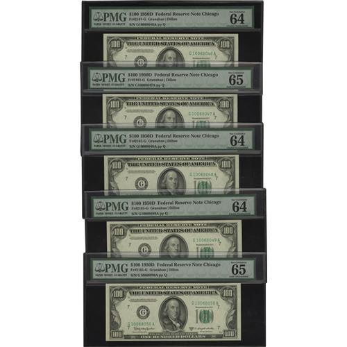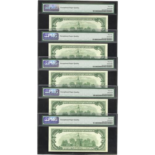 <B>Fr. 2161-G $100 1950D Federal Reserve Notes. PMG Gem Uncirculated 65 EPQ (2), PMG Choice Uncirculated 64 EPQ (3).</B></I><BR> Five pieces, all bearing the Exceptional Paper Quality imprimatur from PMG. <BR><BR><b>Shipping:</b> Coins & Currency (<a target="_blank" href="http://www.heritageauctions.com/common/shipping.php">view shipping information</a>)