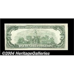 Fr. 2162-B* $100 1950-E Federal Reserve Note. Very Choice Crisp Uncirculated.This is a genuine small size rarity no matter how you slice it. This issue is a scarce short printed issue with star notes from this highest denomination being very elusive in any grade but extremely rare as you approach the zenith of the grading scale. The margins on this New York star are very broad with just a hair more needed at the top for the full gem grade. The paper surfaces are divine as they have retained their original crispness and the ink colors are bold and bright. As a true indication of the scarce nature of this condition the highest grade example sold by CAA in the past three years was a mere CU example (the only CU example) which realized $2,645 two years ago. The market has advanced rapidly for small size rarities since that time and with an Oakes value listed at $4,000 in CU that should merely be considered the starting point for anyone in quest of a triumphant bid. <BR><BR><B>Important notice:</B> Heritage usually auctions material at the rate of 200-250 lots per hour. On some occasions eBay Live bid software or the Internet may not be able to keep up with the pace of the auction. We recommend placing a realistic absentee bid now as insurance to avoid disappointment. Occasionally the auctioneer may eliminate or reject an eBay Live bid, and the auctioneer may also reopen a lot after the close of the eBay live bidding (usually because we missed an audience bid), and may reject your bid even if it shows you as the winning bidder. By bidding via eBay Live, you agree that Heritage may award the lot to another bidder at its sole discretion under the circumstances described above or any other reasonable circumstances. Since eBay bids are not shown to us until we open the lot on the floor, we treat those bids just like floor bids. In most cases the floor responds before the eBay bid is presented to us, due to Internet lag time, so for consistency we have made it a policy that floor bids are always considered first over tie eBay live bids. Also please note that all Heritage lots purchased through eBay Live carry a 20% Buyer's Premium. Please make sure you read the Terms and Conditions before you bid. <BR><BR><B>IMPORTANT ANNOUNCEMENT ABOUT RESERVES:</B> Heritage now divulges all reserves on its web site 7 days before every auction. If you want to know whether the reserve on this lot has been met, and if not, what the reserve amount is, please visit this lot page on the HeritageCoin.com web site, or email: bid@HeritageGalleries.com