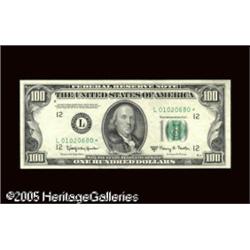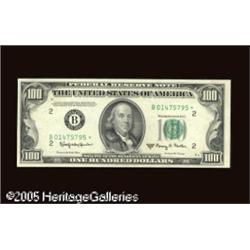 <B>Fr. 2162-B* $100 1950E Federal Reserve Note. About Uncirculated.</B></I><BR><B>Fr. 2162-L* $100 1950E Federal Reserve Note. About Uncirculated.</B></I><BR>The light embrace of circulation greeted this scarce pair of replacements. Oakes does not report a single $100 star serial number for the Chicago district from the 1950E series. This lot includes the only other two districts printed for the 1950E series.<BR> 2 notes Lot:16443