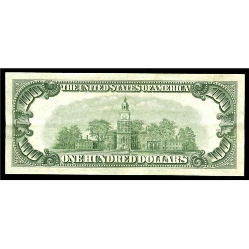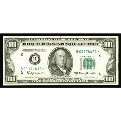 <B>Fr. 2162-B* $100 1950E Federal Reserve Note. Extremely Fine.</B></I><BR>Here is a high grade example of this very scarce star. There is one horizontal and one vertical fold, yet at first glance this piece appears identical to a $3000 Uncirculated specimen. Only the New York, Chicago, and San Francisco districts issued this series. This was the last series printed from the wet intaglio method when the BEP brought out of mothballs the old presses to handle the need for more paper money caused by the inflation of the mid-1960s.