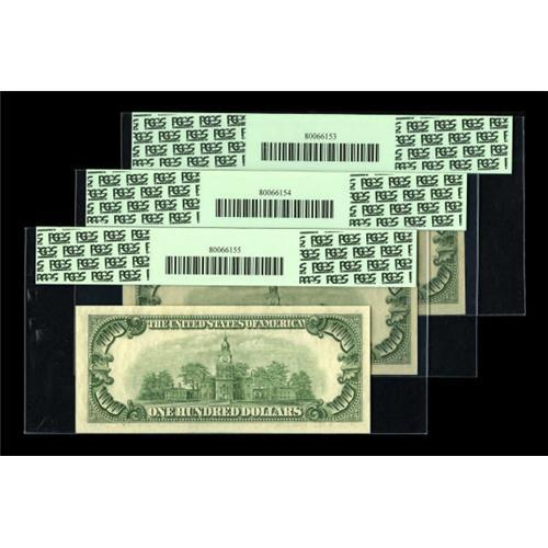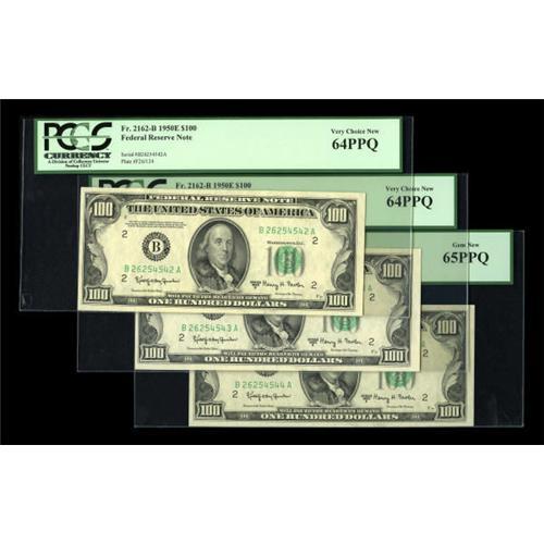 <B>Fr. 2162-B $100 1950E Federal Reserve Notes. Three Consecutive Examples. PCGS Gem New 65PPQ and Very Choice New 64PPQ (2)</B></I>.<B></B></I><BR> This pleasing trio contains notes with bold embossing and even margins. Elusive at these grade levels, there is no telling when another original mini run as this will surface.<BR><BR><b>Shipping:</b> Coins & Currency (<a target="_blank" href="http://www.heritageauctions.com/common/shipping.php">view shipping information</a>)