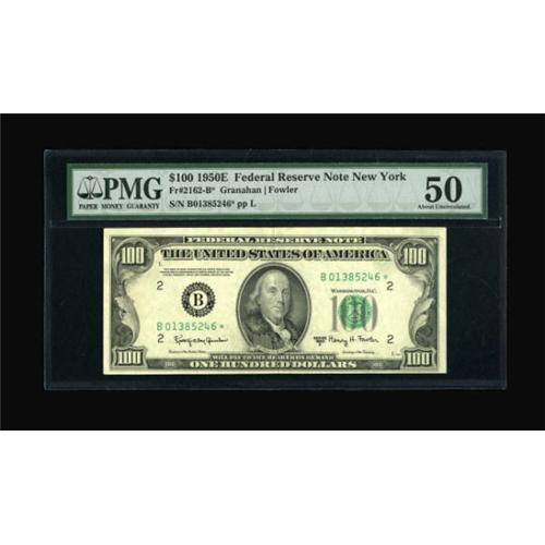 <B>Fr. 2162-B* $100 1950E Federal Reserve Note. PMG About Uncirculated 50.</B></I><BR> A lone center fold is noted on this issue. The last AU we handled realized a touch more than $1000. That price may prove conservative as this is only the second example of this scarce star to appear in our auctions this year.<BR><BR><b>Shipping:</b> Coins & Currency (<a target="_blank" href="http://www.heritageauctions.com/common/shipping.php">view shipping information</a>)