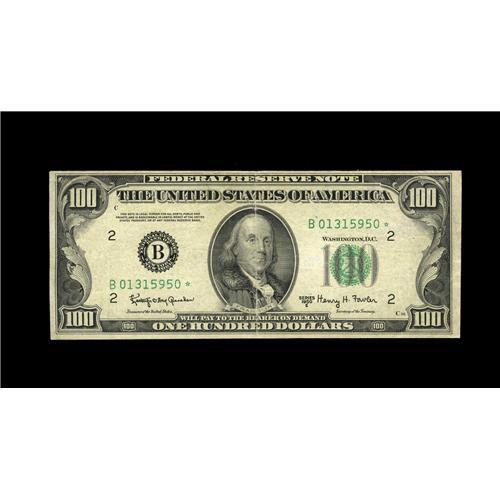 <B>Fr. 2162-B* $100 1950E Federal Reserve Note. Very Fine.</B></I><BR>There is a tiny and barely discernible number stamped on the face of this scarce star.