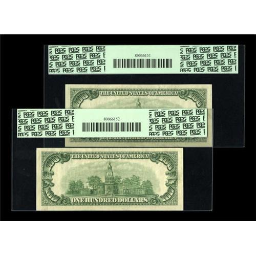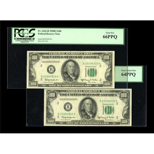 <B>Fr. 2162-B $100 1950E Federal Reserve Notes. Two Consecutive Examples. PCGS Gem New 66PPQ and Very Choice New 64PPQ </B></I>.<B></B></I><BR> This pristine, well embossed Big Apple pair is separated in grade by centering differences.<BR><BR><b>Shipping:</b> Coins & Currency (<a target="_blank" href="http://www.heritageauctions.com/common/shipping.php">view shipping information</a>)