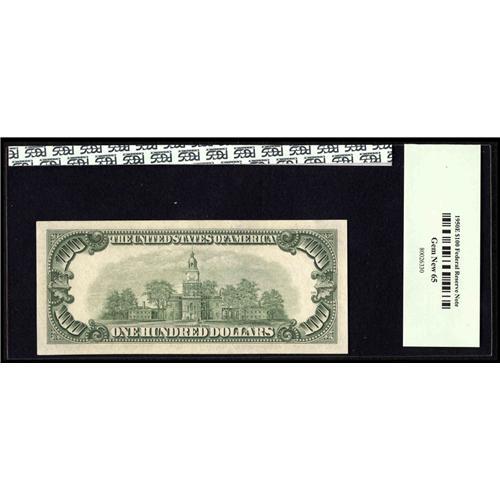 <B>Fr. 2162-B* $100 1950E Federal Reserve Note. PCGS Gem New 65.</B></I><BR>Sizeable margins are the prime attribute of this scarce replacement note. An estimated 288,000 notes were printed.