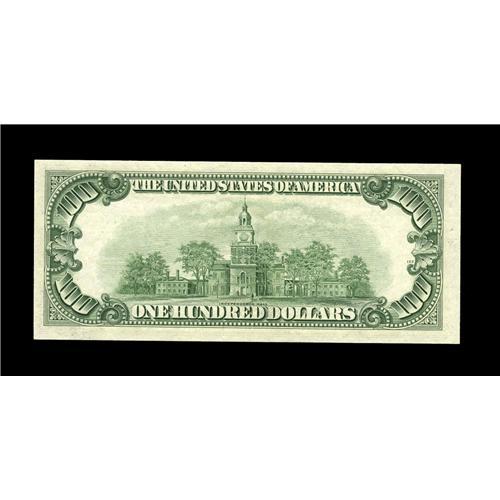 <B>Fr. 2162-G $100 1950E Federal Reserve Note. Choice Crisp Uncirculated.</B></I><BR>Just as fresh and original as the adjacent lot (from the same consignment), but the centering here will not permit a grade higher than Choice. It still would not surprise us if the rarity of this note in CU or better carries it past the Oakes catalogue value of $1000.