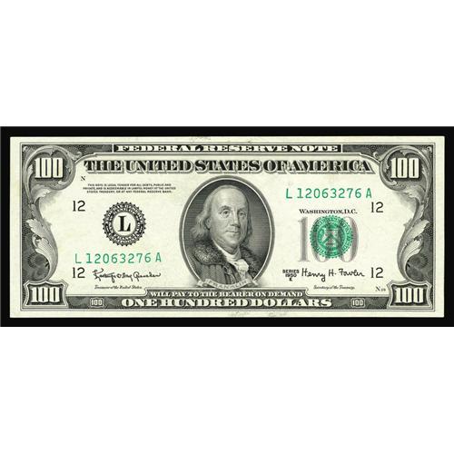 <B>Fr. 2162-L $100 1950E Federal Reserve Note. Crisp Uncirculated.</B></I><BR>This is a very challenging district from a scarce short printed issue for which only three districts had notes printed. This particular example is crisp and fresh with bright green ink colors and sharp print quality, but is a tad flat.