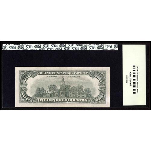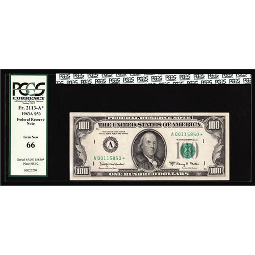 <B>Fr. 2163-A* $100 1963A Federal Reserve Note. PCGS Gem New 66.</B></I><BR>A new high number from Boston for this denomination and series by a considerable margin as reported in the Oakes-Schwartz reference. Even experts can make mistakes, however, as the holder certifies this note to be a "Fr. 2113-A* 1963A $50 Federal Reserve Note."