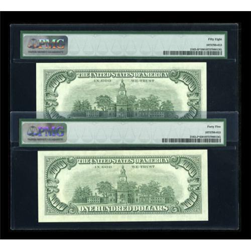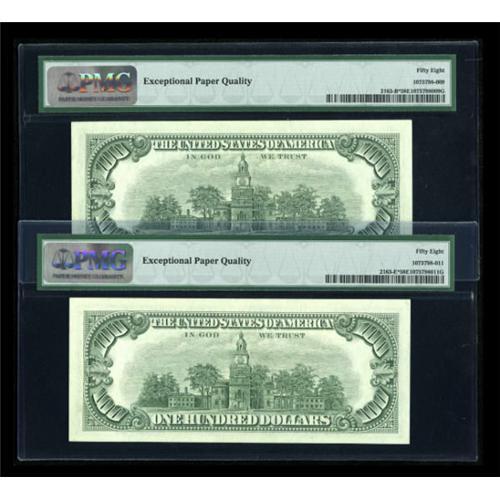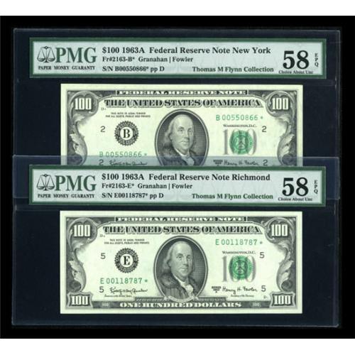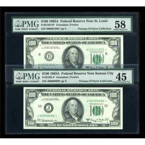 <B>Fr. 2163-B* $100 1963A Federal Reserve Note PMG Choice AU 58 EPQ<BR>Fr. 2163-E* $100 1963A Federal Reserve Note PMG Choice AU 58 EPQ<BR>Fr. 2163-H* $100 1963A Federal Reserve Note PMG Choice AU 58<BR>Fr. 2163-J* $100 1963A Federal Reserve Note PMG Choice EF 45</B></I><BR> Four high grade but not quite uncirculated stars. <BR><I>From The Thomas M. Flynn Collection</B></I><BR><BR><b>Shipping:</b> Coins & Currency (<a target="_blank" href="http://www.heritageauctions.com/common/shipping.php">view shipping information</a>)