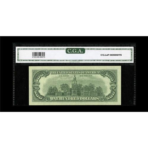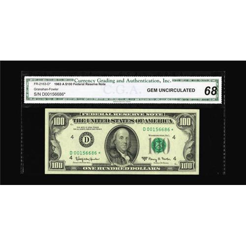 <B>Fr. 2163-D* $100 1963A Federal Reserve Note. CGA Gem Uncirculated 68.</B></I><BR>With only a print run of 192,000 not many examples have surely survived with margins and surfaces like this example.