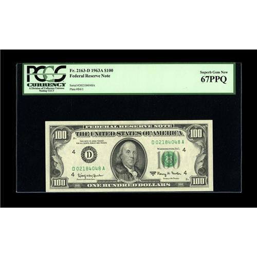 <B>Fr. 2163-D $100 1963A Federal Reserve Note. PCGS Superb Gem New 67PPQ.</B></I><BR>Visually stunning.<BR><BR><b>Shipping:</b> Coin/Currency (<a target="_blank" href="http://www.heritageauctions.com/common/shipping.php">view shipping information</a>)