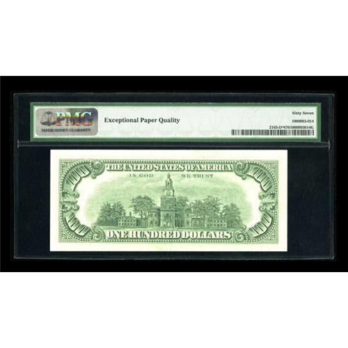 <B>Fr. 2163-D* $100 1963A Federal Reserve Note. PMG Superb Gem Unc 67 EPQ.</B></I><BR> A most pleasing Cleveland Star with broad and perfectly even margins.<BR><BR><b>Shipping:</b> Coins & Currency (<a target="_blank" href="http://www.heritageauctions.com/common/shipping.php">view shipping information</a>)