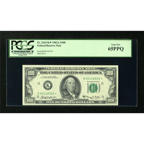 <B>Fr. 2163-K* $100 1963A Federal Reserve Star Note. PCGS Gem New 65PPQ.</B></I><BR> Huge margins are noticed on this well embossed Dallas replacement note which had a low print run of just 192,000 notes.<BR><BR><b>Shipping:</b> Coins & Currency (<a target="_blank" href="http://www.heritageauctions.com/common/shipping.php">view shipping information</a>)