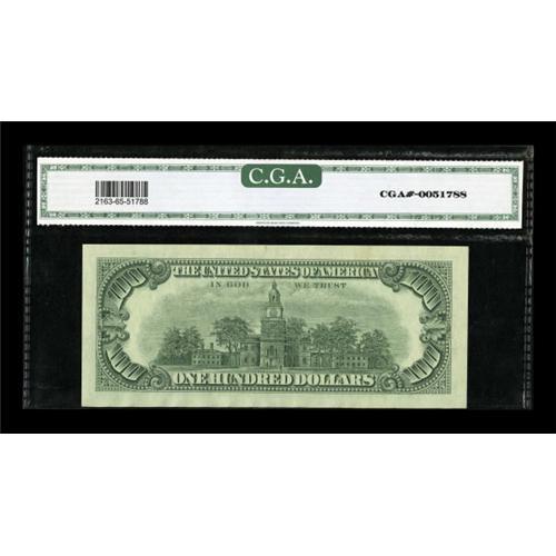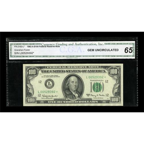 <B>Fr. 2163-L* $100 1963A Federal Reserve Note. CGA Gem Uncirculated 65.</B></I><BR> This pleasing San Francisco replacement note serves up huge margins.<BR><BR><b>Shipping:</b> Coins & Currency (<a target="_blank" href="http://www.heritageauctions.com/common/shipping.php">view shipping information</a>)