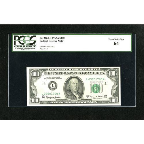 <B>Fr. 2163-L $100 1963A Federal Reserve Note. PCGS Very Choice New 64.</B></I><BR>This early FRN is nicely margined with bright inks.<BR><BR><b>Shipping:</b> Coins & Currency (<a target="_blank" href="http://www.heritageauctions.com/common/shipping.php">view shipping information</a>)