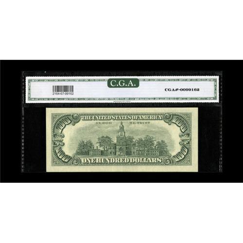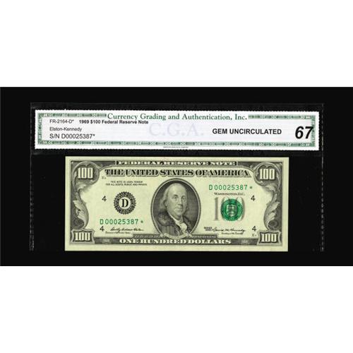 <B>Fr. 2164-D* $100 1969 Federal Reserve Note. CGA Gem Uncirculated 67.</B></I><BR>The margins are broad and the back centering near perfect on this Cleveland Star which becomes the highest known serial number.