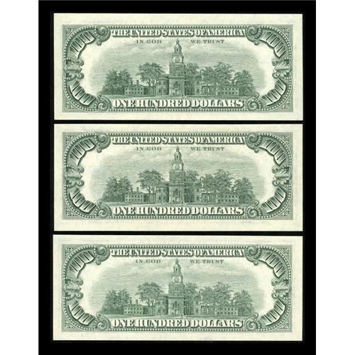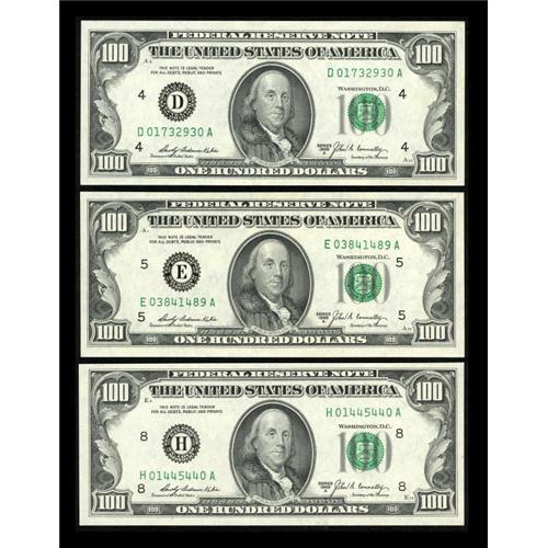<B>Fr. 2165-D; E; H $100 1969A Federal Reserve Notes. Choice Crisp Uncirculated or Better.</B></I><BR> Nice embossing is readily apparent on this choice group of C-notes from the 1969A series.<BR><I>From The Thomas M. Flynn Collection</B></I><BR><BR><b>Shipping:</b> Coins & Currency (<a target="_blank" href="http://www.heritageauctions.com/common/shipping.php">view shipping information</a>)