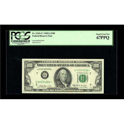 <B>Fr. 2165-G* $100 1969A Federal Reserve Note. PCGS Superb Gem New 67PPQ.</B></I><BR>Broad margins and deep inks complete this Chi-town C-note.<BR><I>From The Bill and Kathy Stella Currency Collection</B></I><BR><BR><b>Shipping:</b> Coin/Currency (<a target="_blank" href="http://www.heritageauctions.com/common/shipping.php">view shipping information</a>)