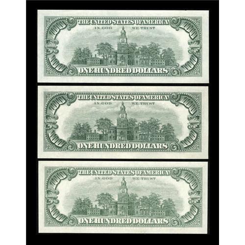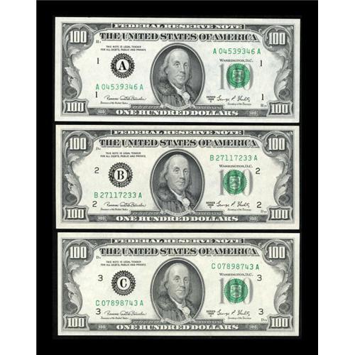 <B>Fr. 2166-A; B; C $100 1969C Federal Reserve Notes. Choice Crisp Uncirculated or Better.</B></I><BR> George Schultz's signature appears for the first time as Treasury Secretary on the 1969C series. Three different districts are represented in this choice trio of $100 FRNs.<BR><I>From The Thomas M. Flynn Collection</B></I><BR><BR><b>Shipping:</b> Coins & Currency (<a target="_blank" href="http://www.heritageauctions.com/common/shipping.php">view shipping information</a>)
