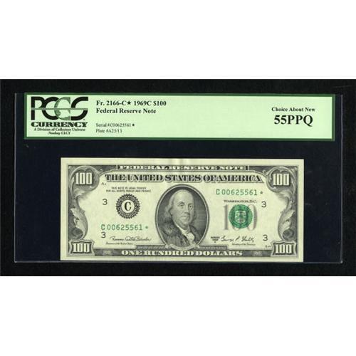 <B>Fr. 2166-C* $100 1969C Federal Reserve Note. PCGS Choice About New 55PPQ.</B></I><BR> This is the first time that this Friedberg number has made it into any of our auctions. In fact, it was even missing from the massive Taylor Family Collection that we sold in February 2005.<BR><BR><b>Shipping:</b> Coins & Currency (<a target="_blank" href="http://www.heritageauctions.com/common/shipping.php">view shipping information</a>)